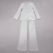 تتميز هذه المجموعة المكونة من ثلاث قطع بأسلوب براق ومقاس عادي، وهي مصنوعة من قماش بوليستر عالي الجودة. النمط بسيط ولكنه لافت للنظر، ويتميز بزر غير مزخرف وفتحة عنق كلاسيكية. الأكمام ذات المقاس العادي طويلة، والبنطلون ذو ارتفاع عالٍ وطول كامل. هذه المجموعة مثالية لموسم الربيع أو الخريف.