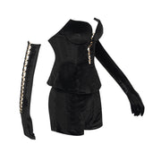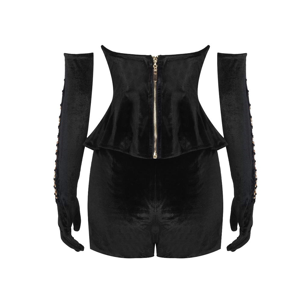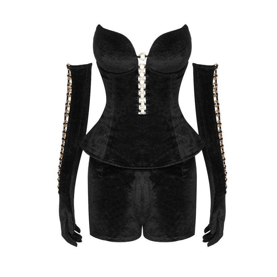 استمتعي بالأناقة الفاخرة مع طقم شورت فيرارا المخملي + قفازات. يتميز هذا الطقم الرائع بقصّة نحيفة ونمط متين ومتطور مصنوع من مخمل فاخر. يضيف خط العنق على شكل حرف V والعنصر الدائري والتصميم المرتفع لمسة من التألق بينما يجعل الجزء العلوي بدون أكمام والجزء السفلي القصير مثاليًا لأي مناسبة خريفية/شتوية. مصنوع من مخمل عالي الجودة وبوليستر، هذا الطقم ينضح بالحصرية والرقي.
