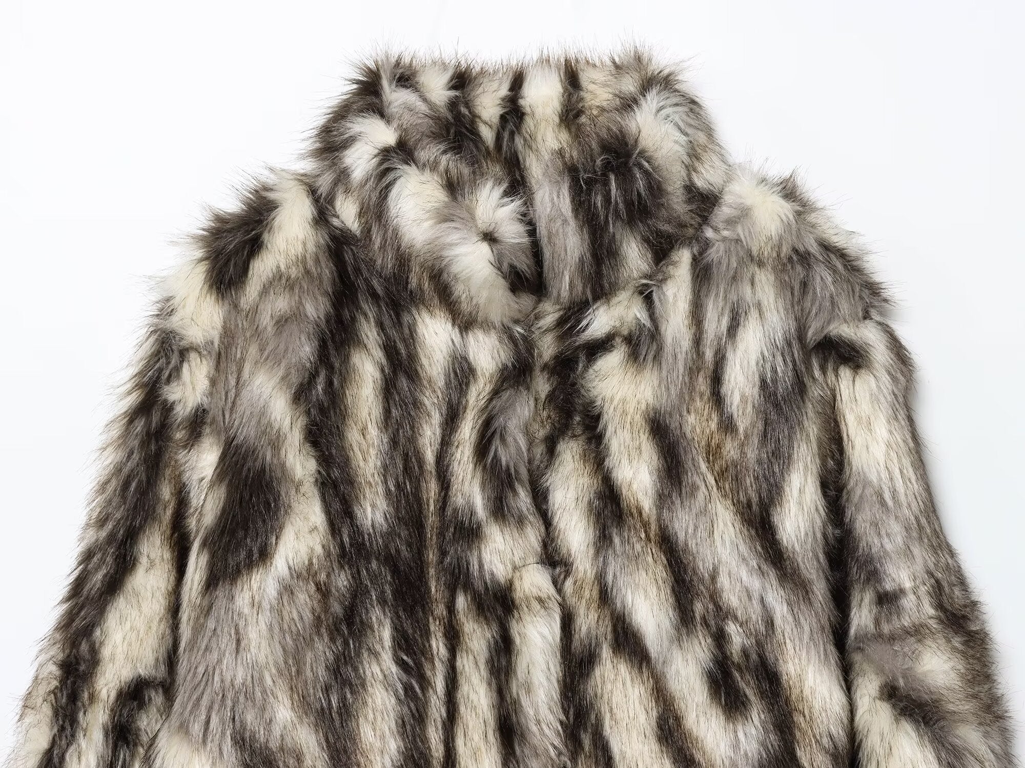 Turn heads in this bold statement coat featuring eye-catching animal print faux fur. The relaxed loose fit ensures comfort and ease of movement, while practical pockets and hook closure add functionality. An instant upgrade to any fall and winter ensemble.
