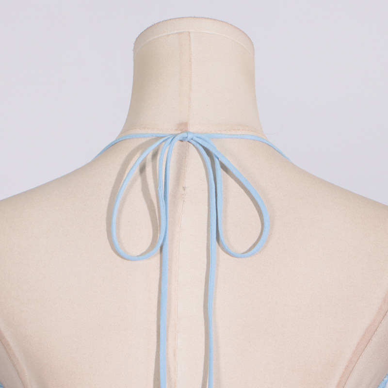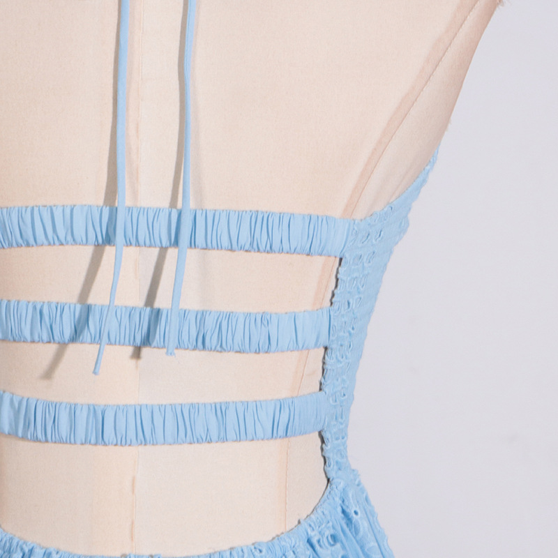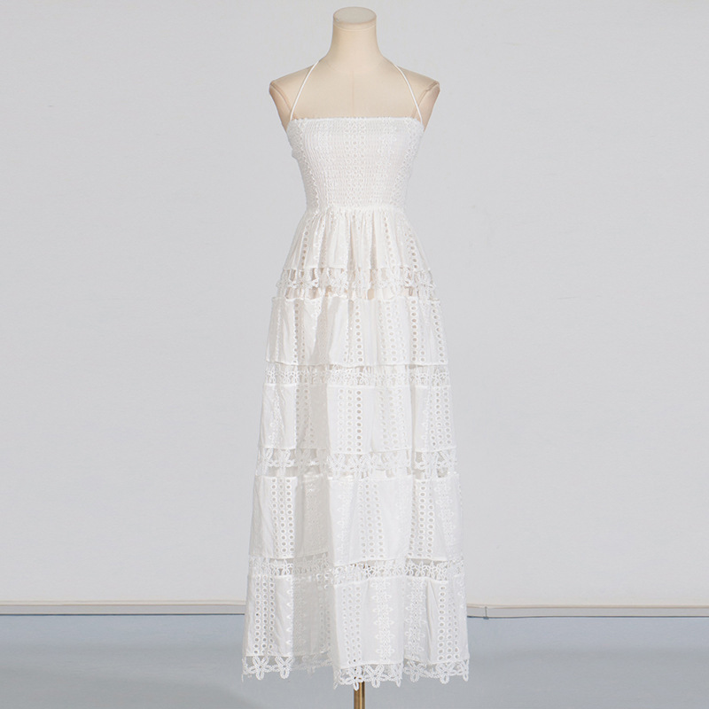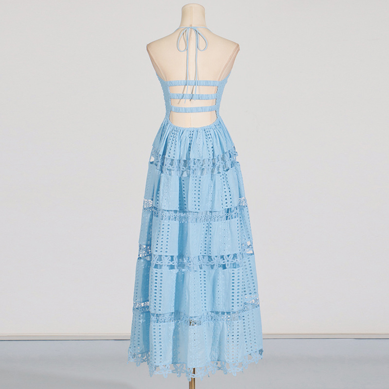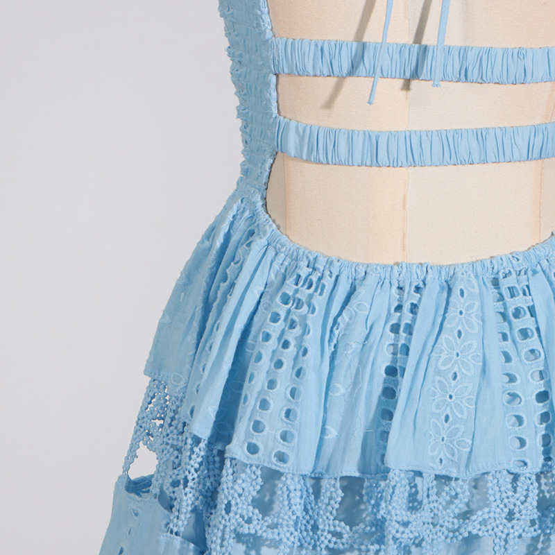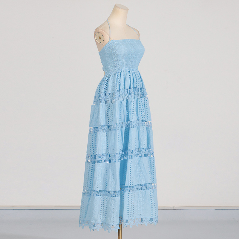 Indulge in the luxurious elegance of this regular-fit polyester dress, featuring embroidered floral lace detailing and a cutout back. With a halter neckline and sleeveless design, this tiered A line dress is perfect for daily wear during the summer months. Crafted in high-quality polyester fabric, this midi dress boasts intricate tie, smocked, and fishnet elements for added sophistication. Elevate your wardrobe with this timeless cutout dress.