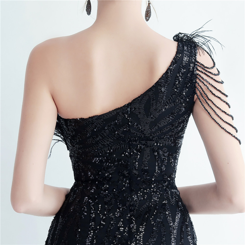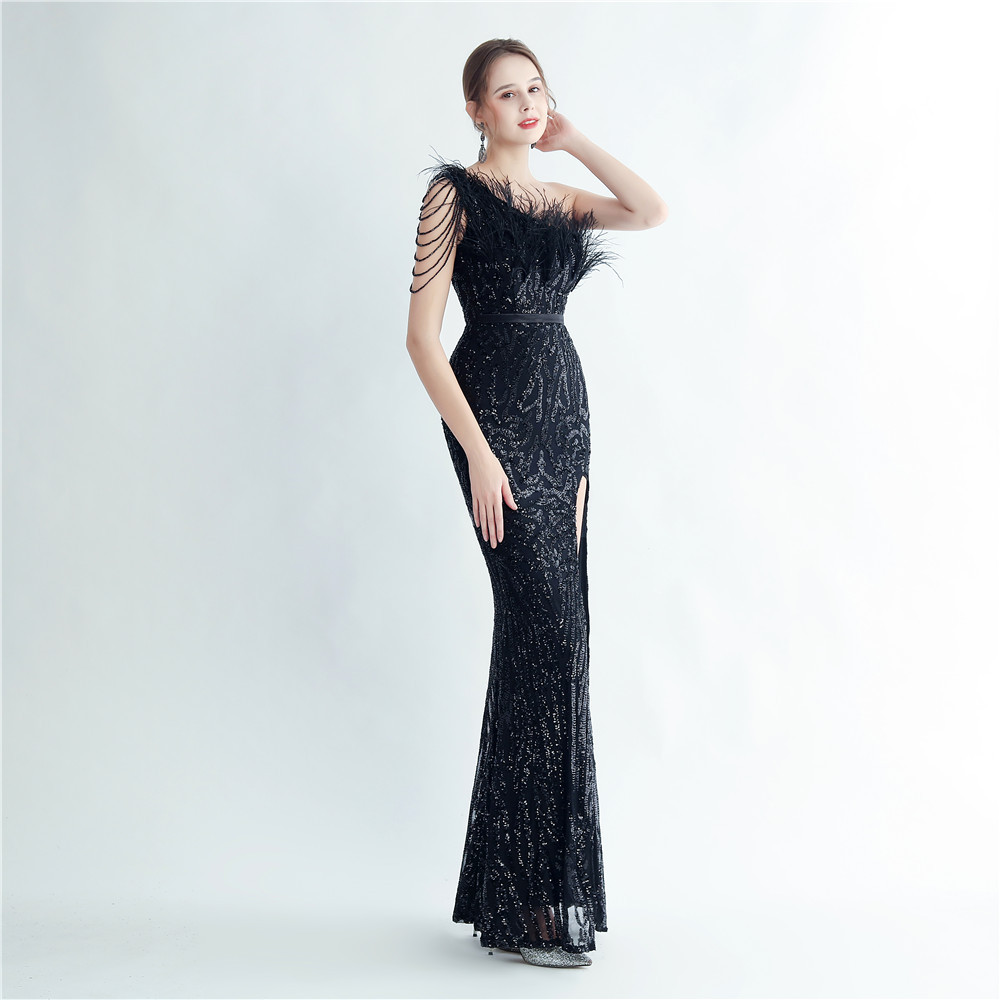 • Featuring a mix of sequins, a zipper, a split, feather accents, and an asymmetric neckline, this maxi dress is the ultimate combination of elegance and sexiness. The slim fit and sleeveless design make it perfect for any formal occasion, and the playful use of polyester fabric adds a touch of fun. Whether it's prom or a formal event, this versatile dress is sure to make a statement.