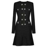 Indulge in timeless sophistication with our Tweed Knit Slim Fit Dress. Crafted from luxurious polyester, this A Line dress features a classic crew neckline, regular long sleeves, and a knee-length hem. The elegant tweed pattern and exquisite button, pocket, and rhinestone detailing add an exclusive touch. Perfect for daily wear during spring and fall, experience the art of understated elegance.
