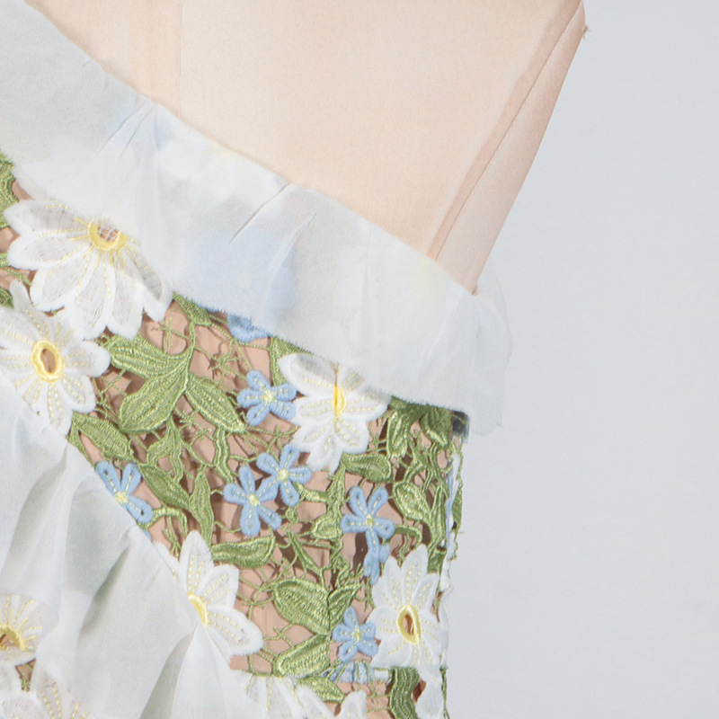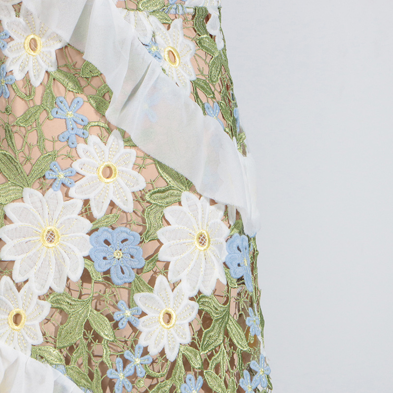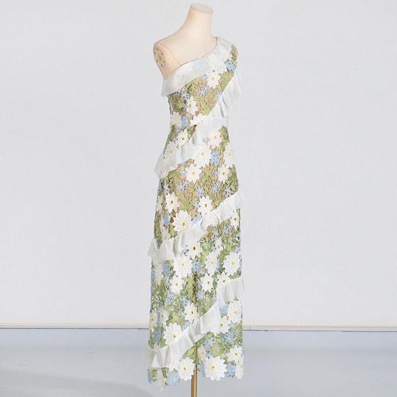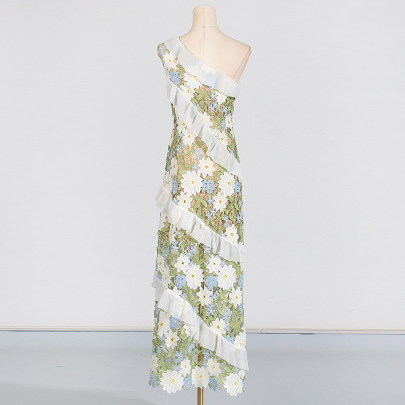 Crafted from a lightweight and breathable polyester fabric, this maxi dress features a slim and sexy fit. The one shoulder neckline and sleeveless design create a sleek and elegant look, while the floral embroidery and patchwork detailing add texture and dimension. Finished with a zipper for ease of wear and an asymmetric hem with ruffle detailing, this bodycon dress is perfect for both daily wear and special occasions during the summer season.