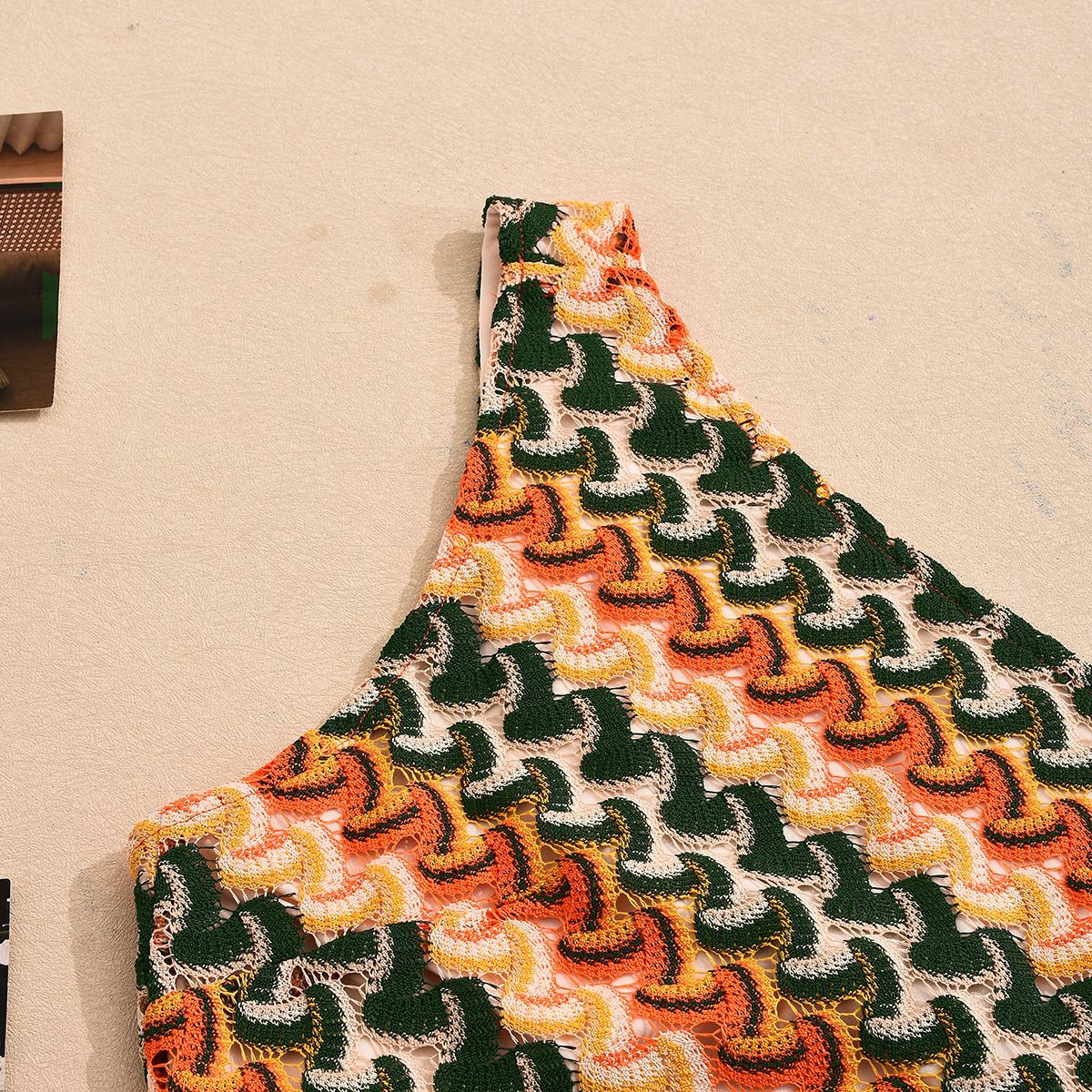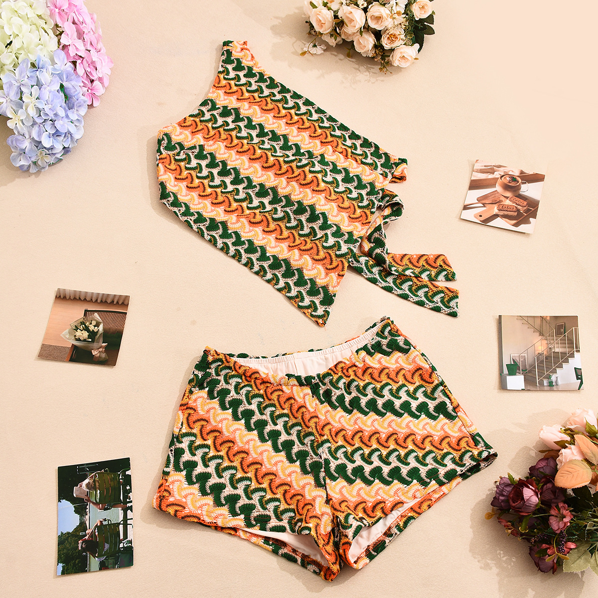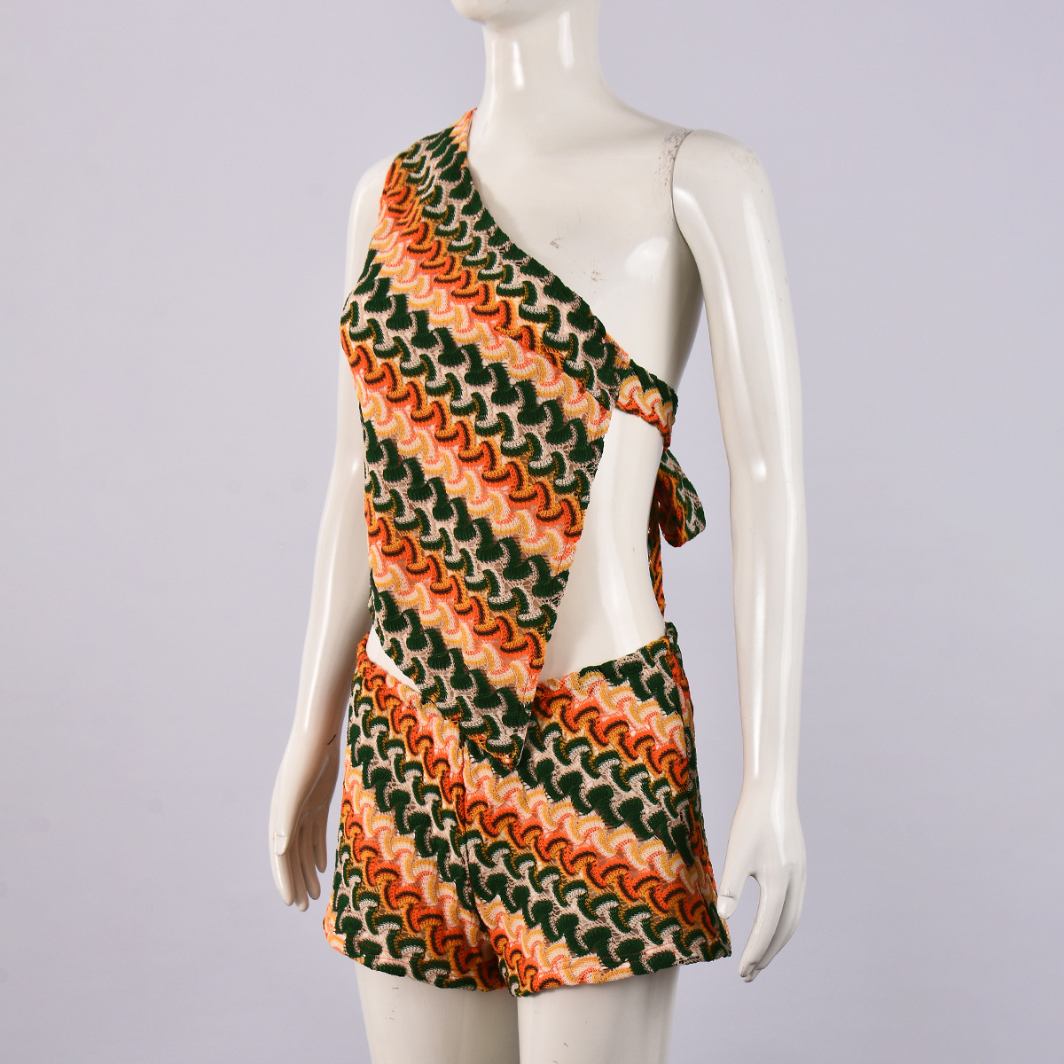 This summer set features a slim, sexy silhouette crafted from jersey fabric with a digital abstract pattern. The asymmetric design includes a one-shoulder, backless top with a tie neckline and sleeveless cut. The low-rise shorts complement the short top length, creating a cohesive and stylish look. Made primarily of polyester, this set offers both comfort and contemporary appeal.