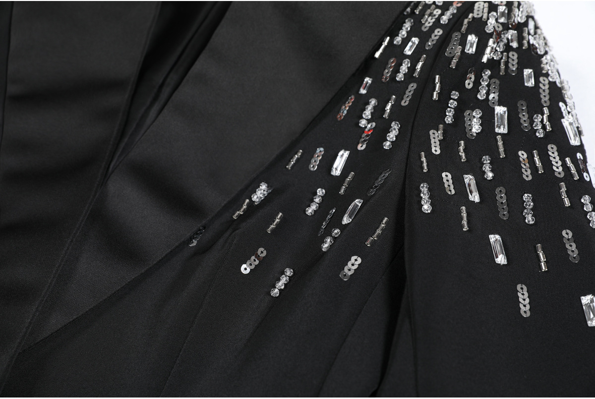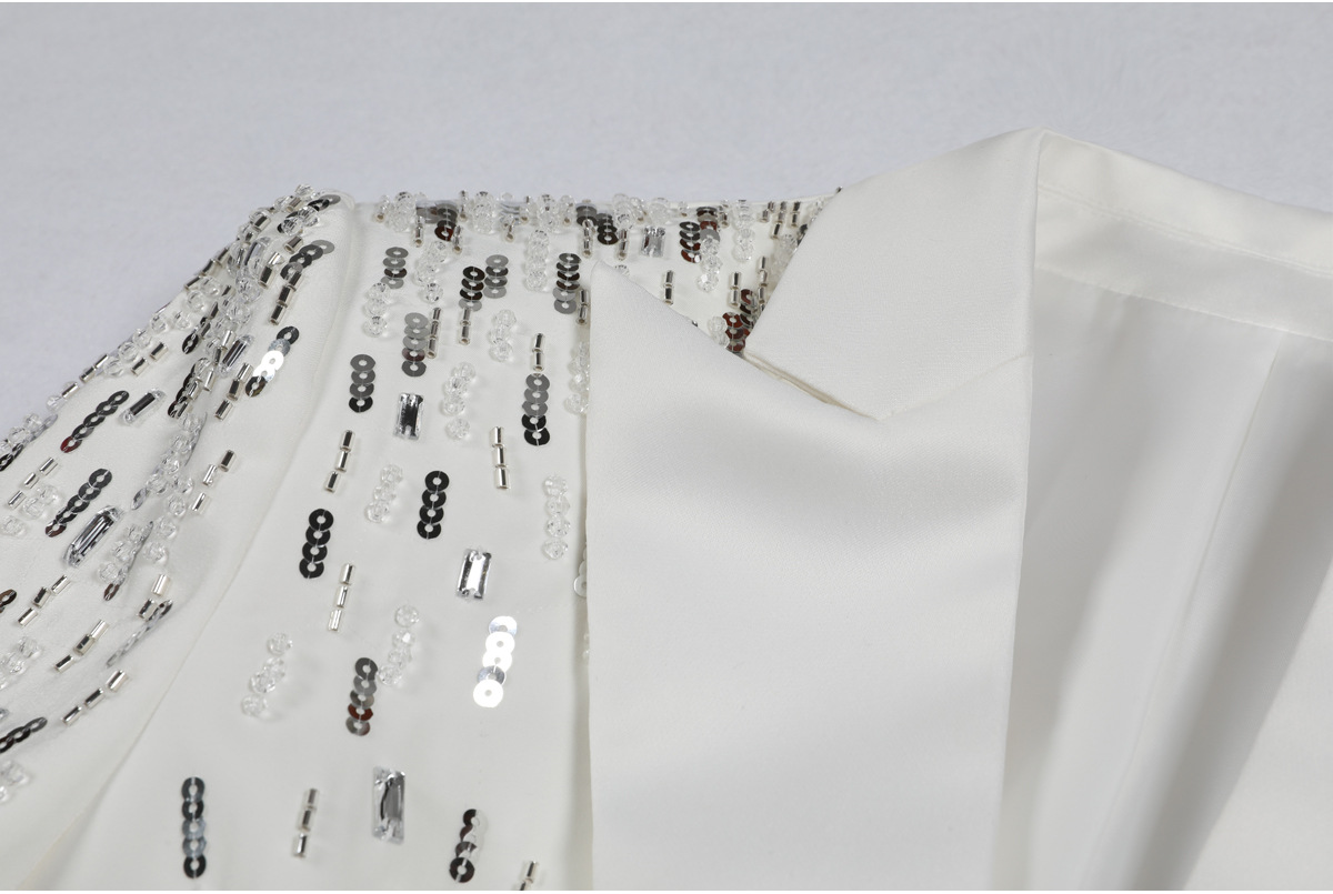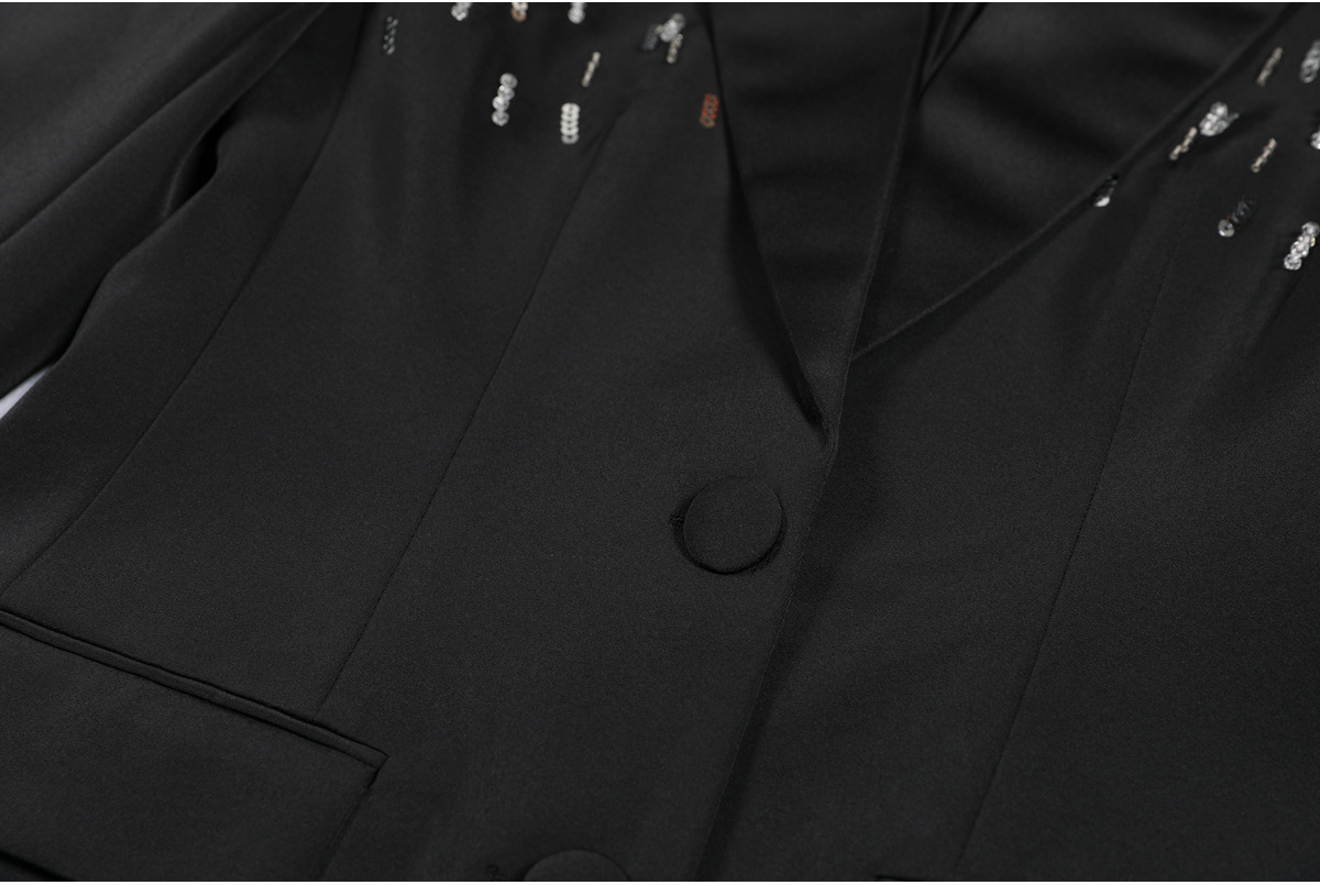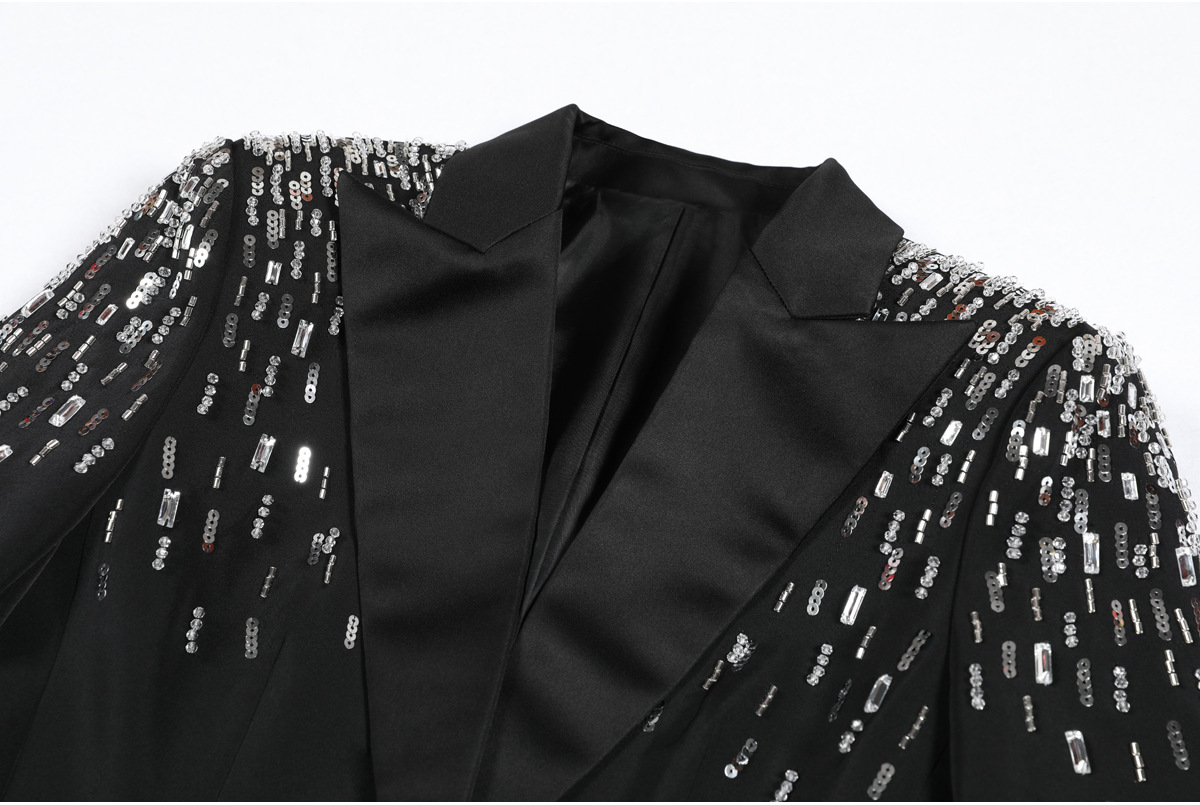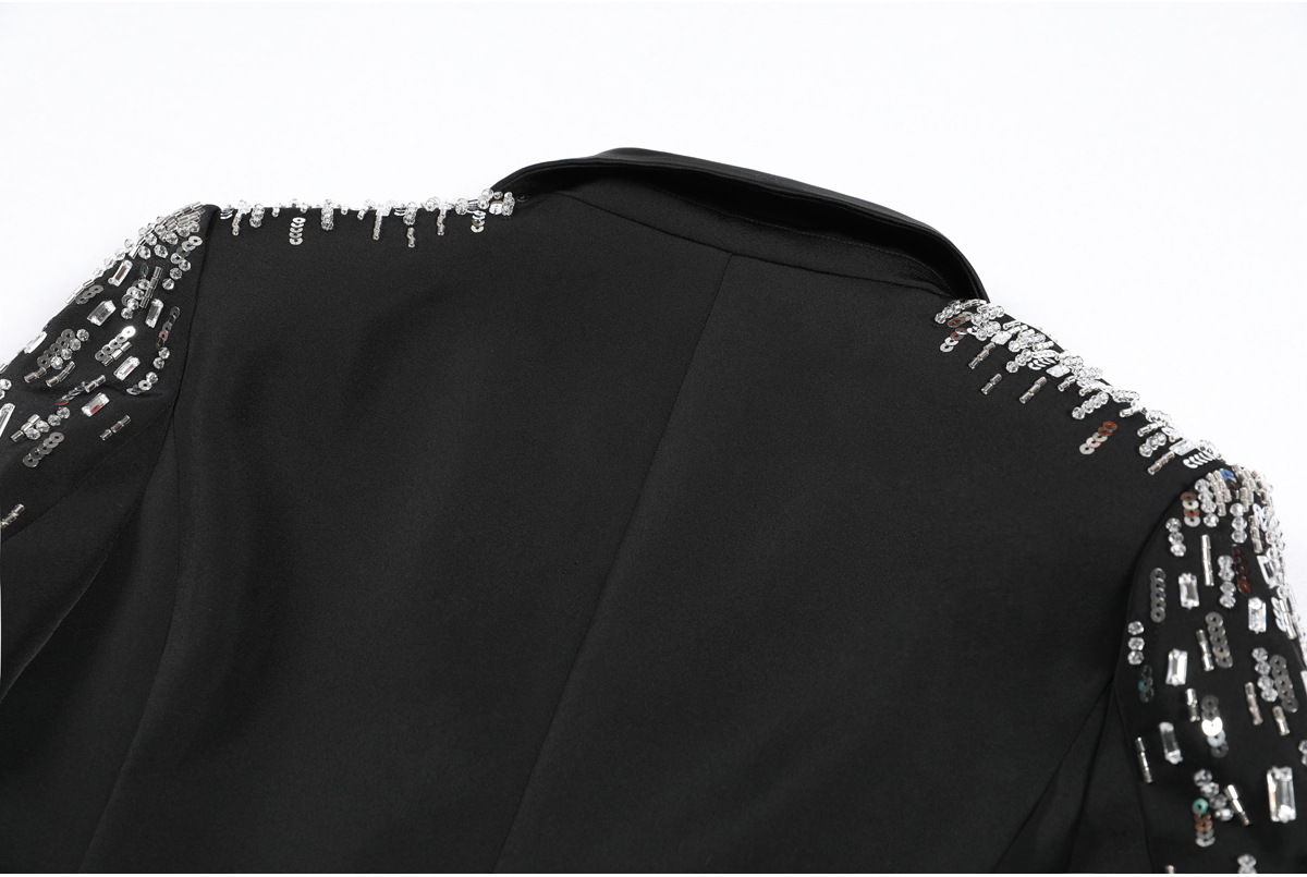 Elevate your style with our Rhinestone-studded Slim Fit Blazer. Crafted with luxurious polyester fabric in a sophisticated solid pattern, this blazer features exquisite rhinestone, button, pocket, and sequin elements. Its long top length and single breasted closure add an extra touch of elegance, making it the perfect choice for the spring and fall seasons. Embrace a sense of exclusivity and sophistication with this premium blazer.