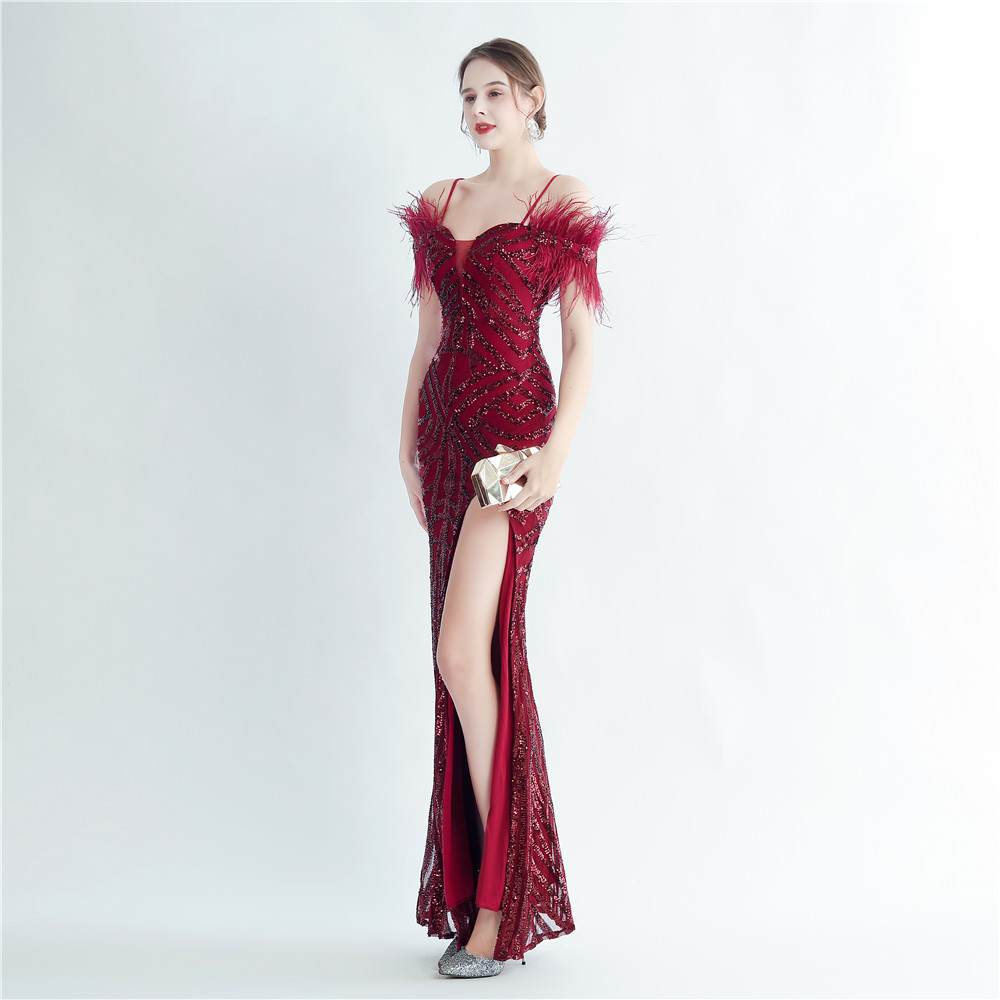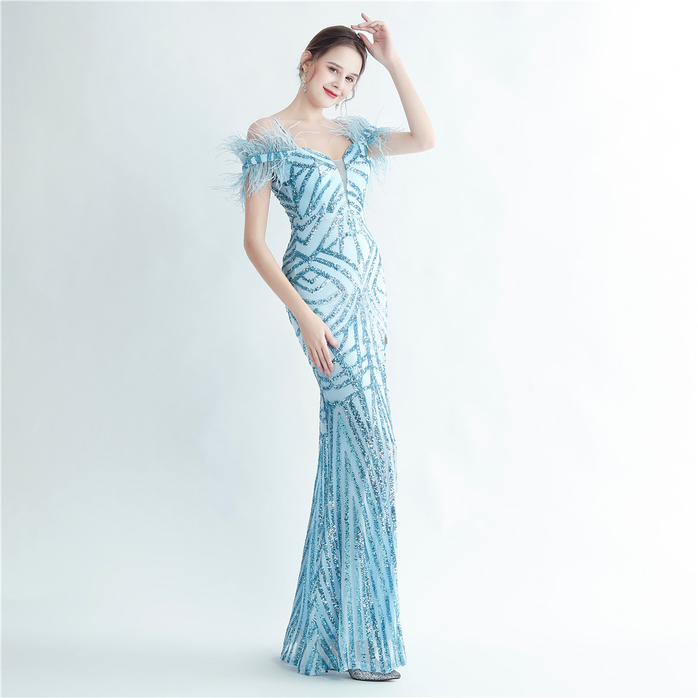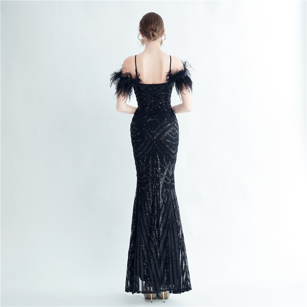 - Add some flair to your formal wardrobe with this playful yet elegant dress! Made with slim polyester fabric, it features feather and sequin elements, a zipper and v-neckline, and unique sleeveless design. Perfect for any occasion, this maxi dress is not your average cami or bodycon dress. Get ready to make a statement at prom or other formal events with this fun and stylish piece.