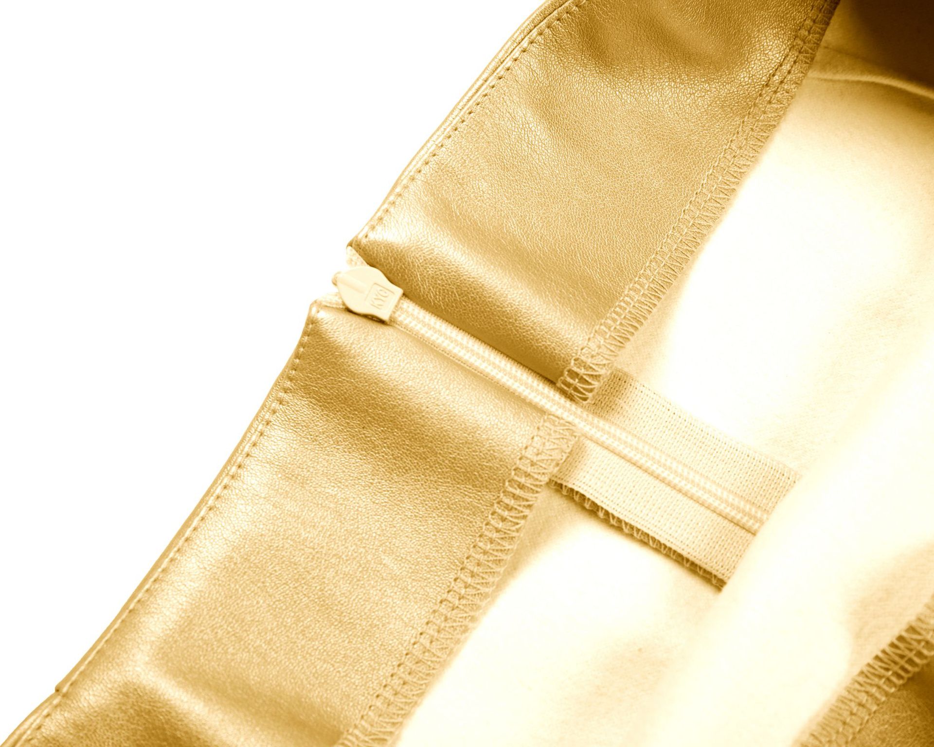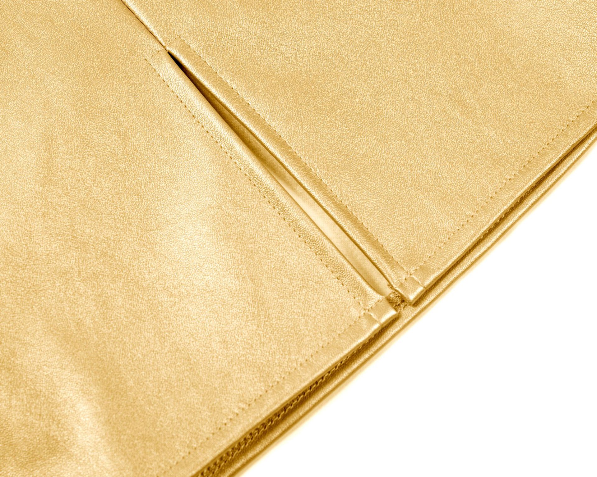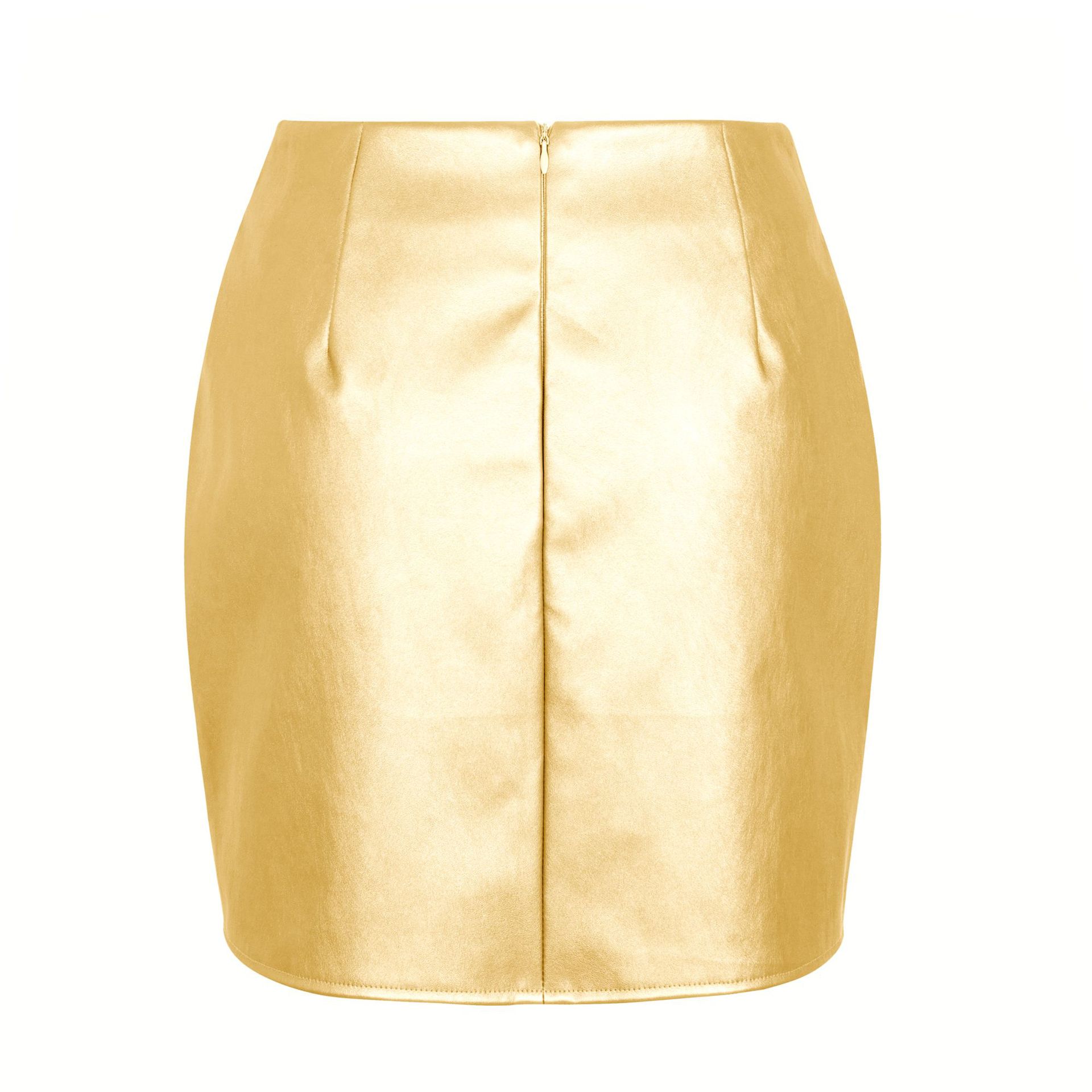 Expertly crafted with a slim fit and high rise, this Gold + Metallic Vegan Leather Mini Skirt features a comfortable split and zipper for a stylish and fashionable element. Made with a blend of polyester and vegan leather, this short skirt is perfect for the summer season.