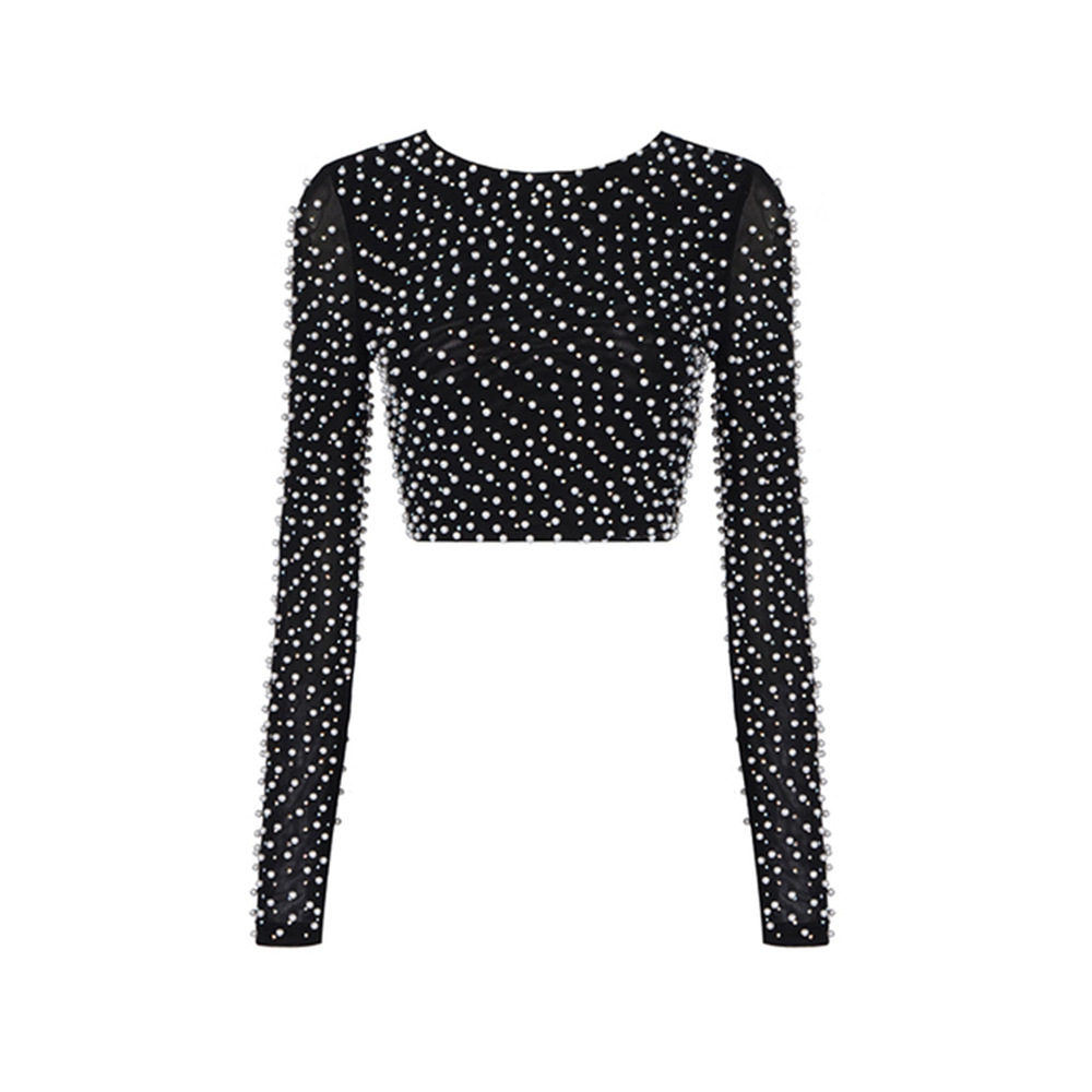 - Elevate your style game with this flirty and chic crop top featuring intricate beading, lace detailing, and rhinestone accents. Designed with a slim fit, regular long sleeves, and a cropped length, this top is perfect for any stylish occasion. Made from high quality polyester, it's the ultimate statement piece for the spring and fall seasons.