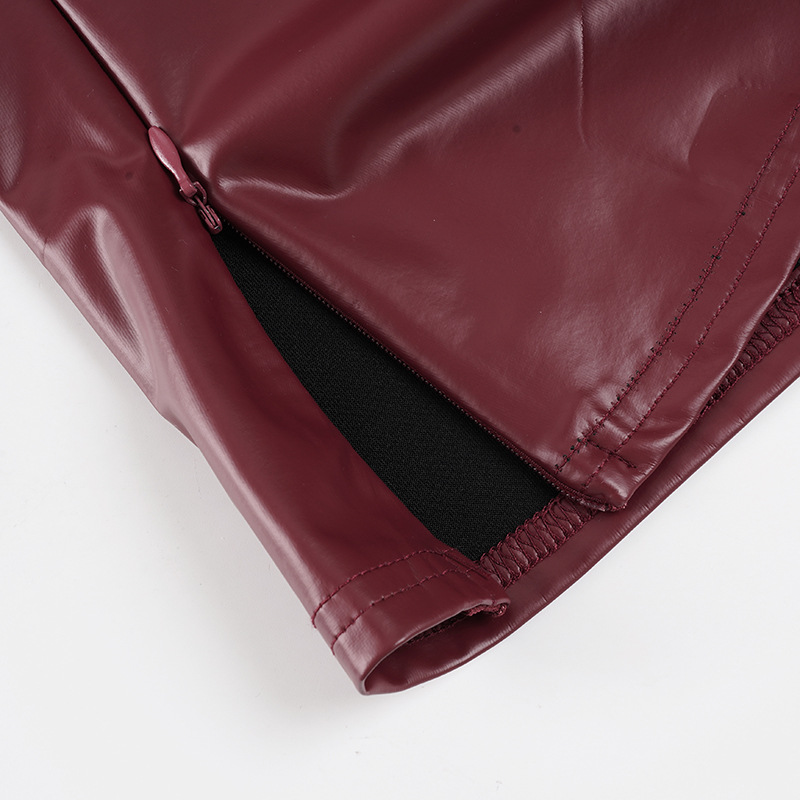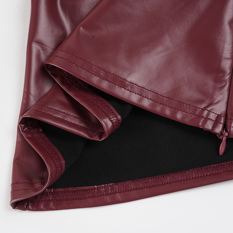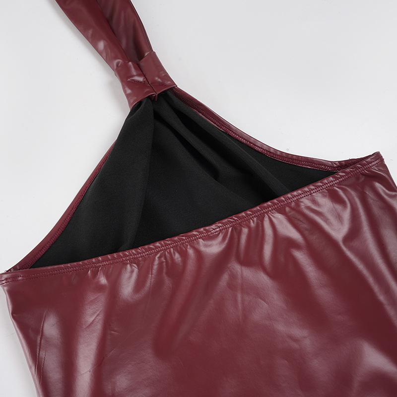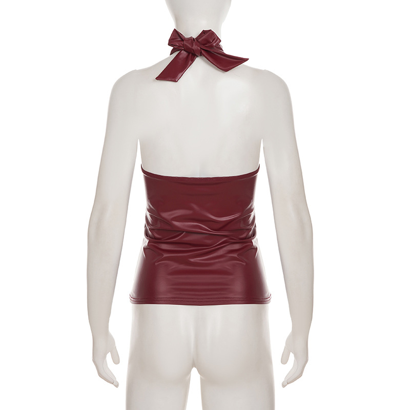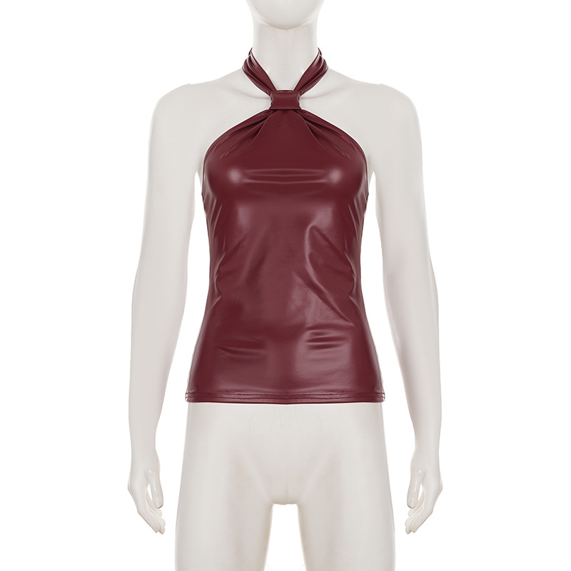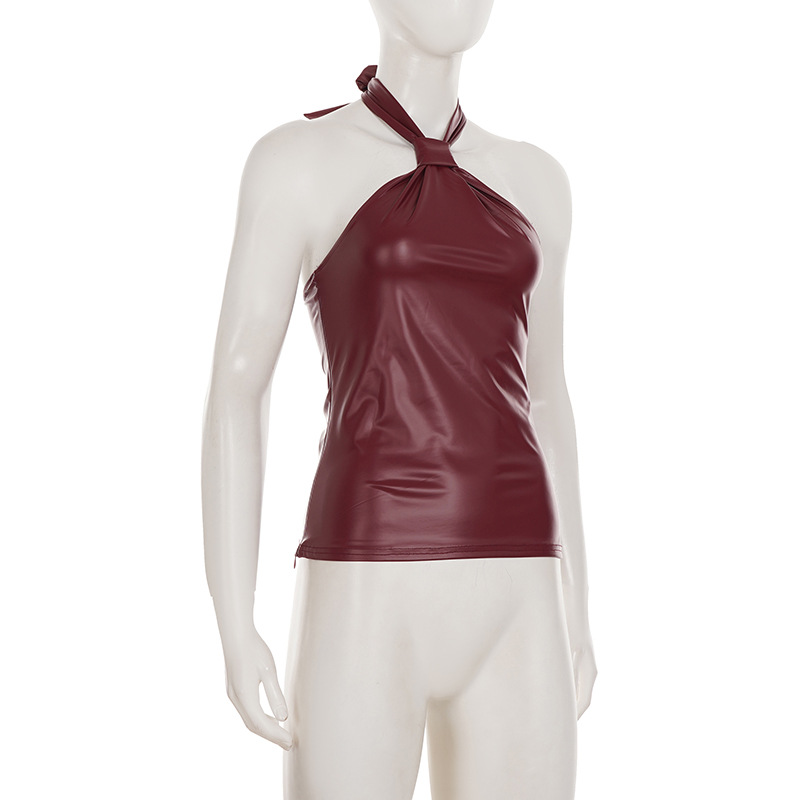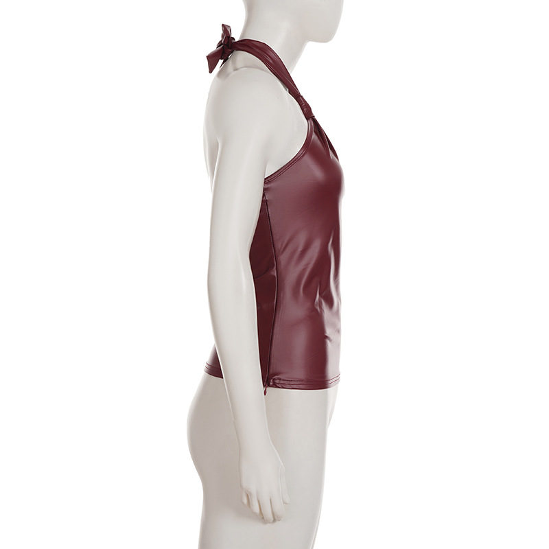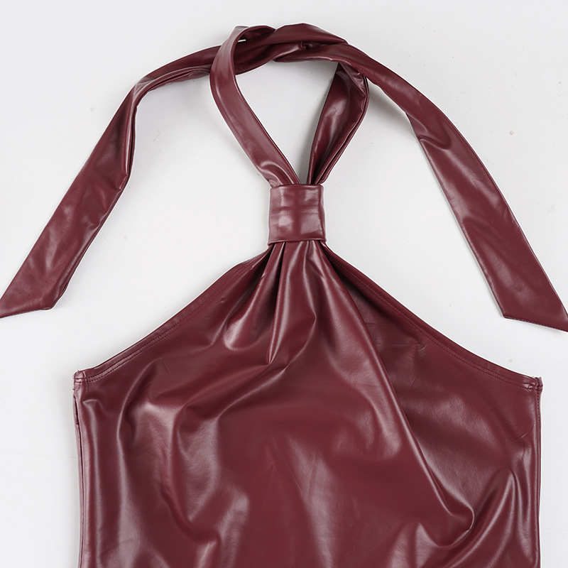 This burgundy halter top combines contemporary edge with refined sophistication. Crafted from premium vegan leather, it features a sleek slim fit designed to flatter your silhouette. The backless design with tie closure and functional zipper detail creates a striking statement piece perfect for summer occasions. Its short length and halter neckline deliver a bold, confident look. Made from durable polyester, this versatile piece transitions seamlessly from evening events to upscale casual settings.
