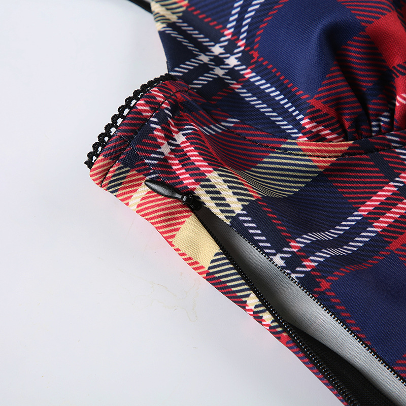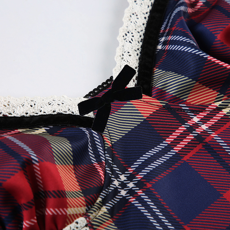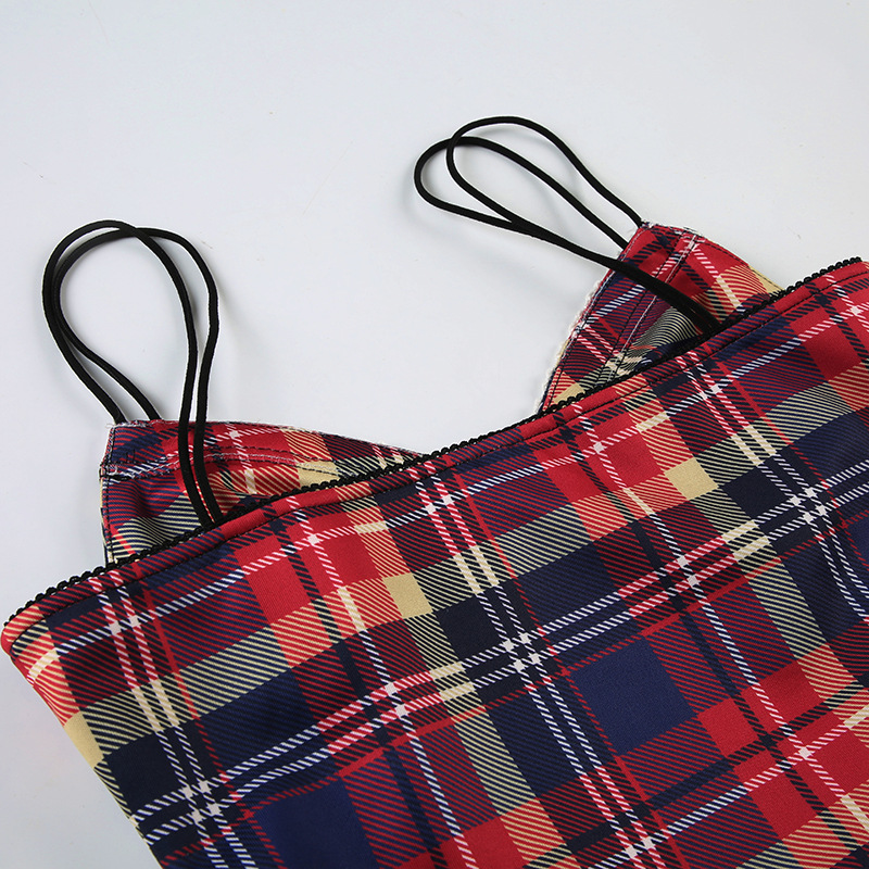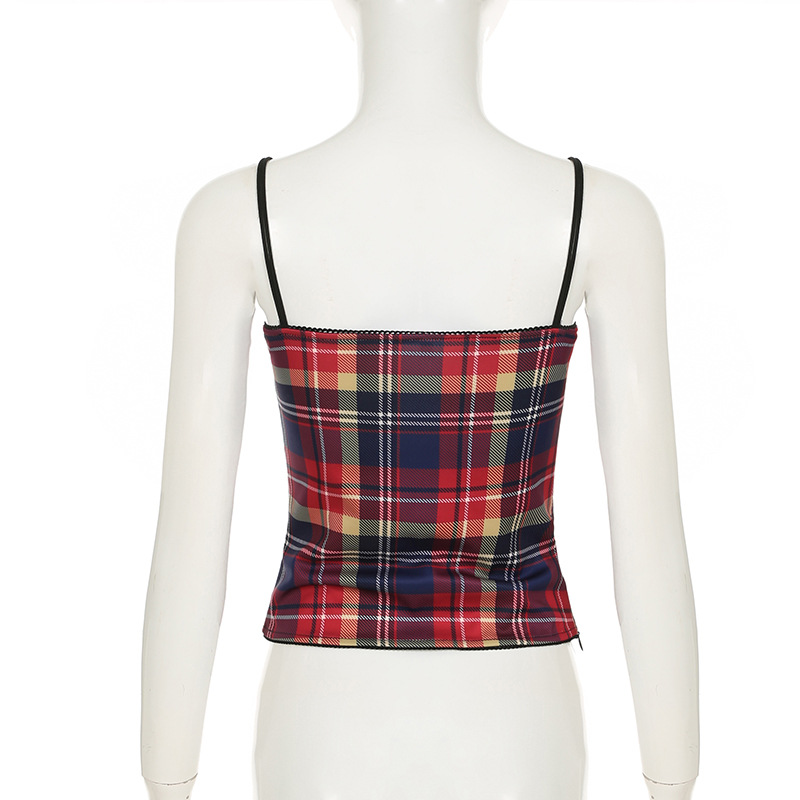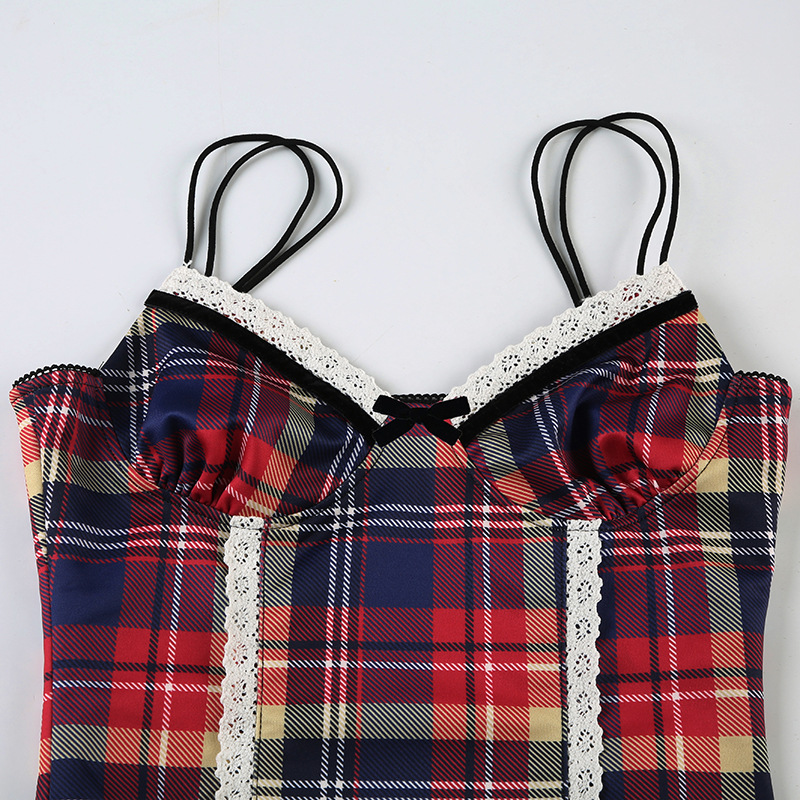 This plaid cami top offers a sleek, form-fitting design made from polyester. Ideal for summer wear, it highlights a V-neck and a cropped length. Accented with a bow, lace, tulle, fishnet, patchwork, and a zipper, it delivers a unique and fashionable statement.