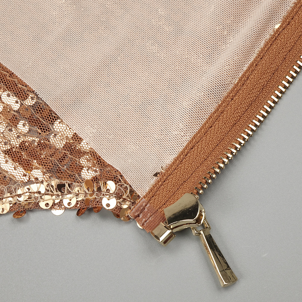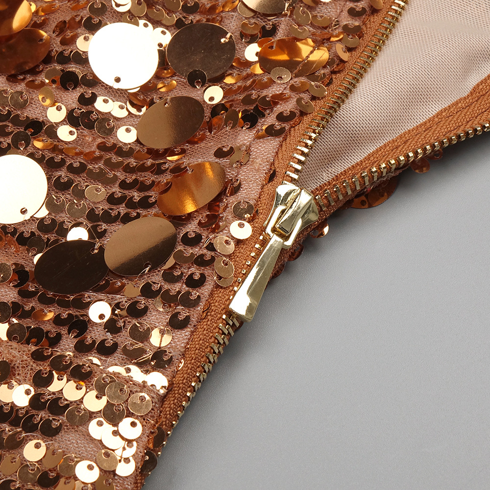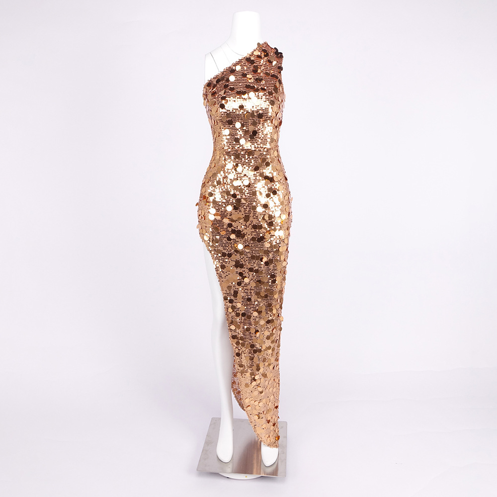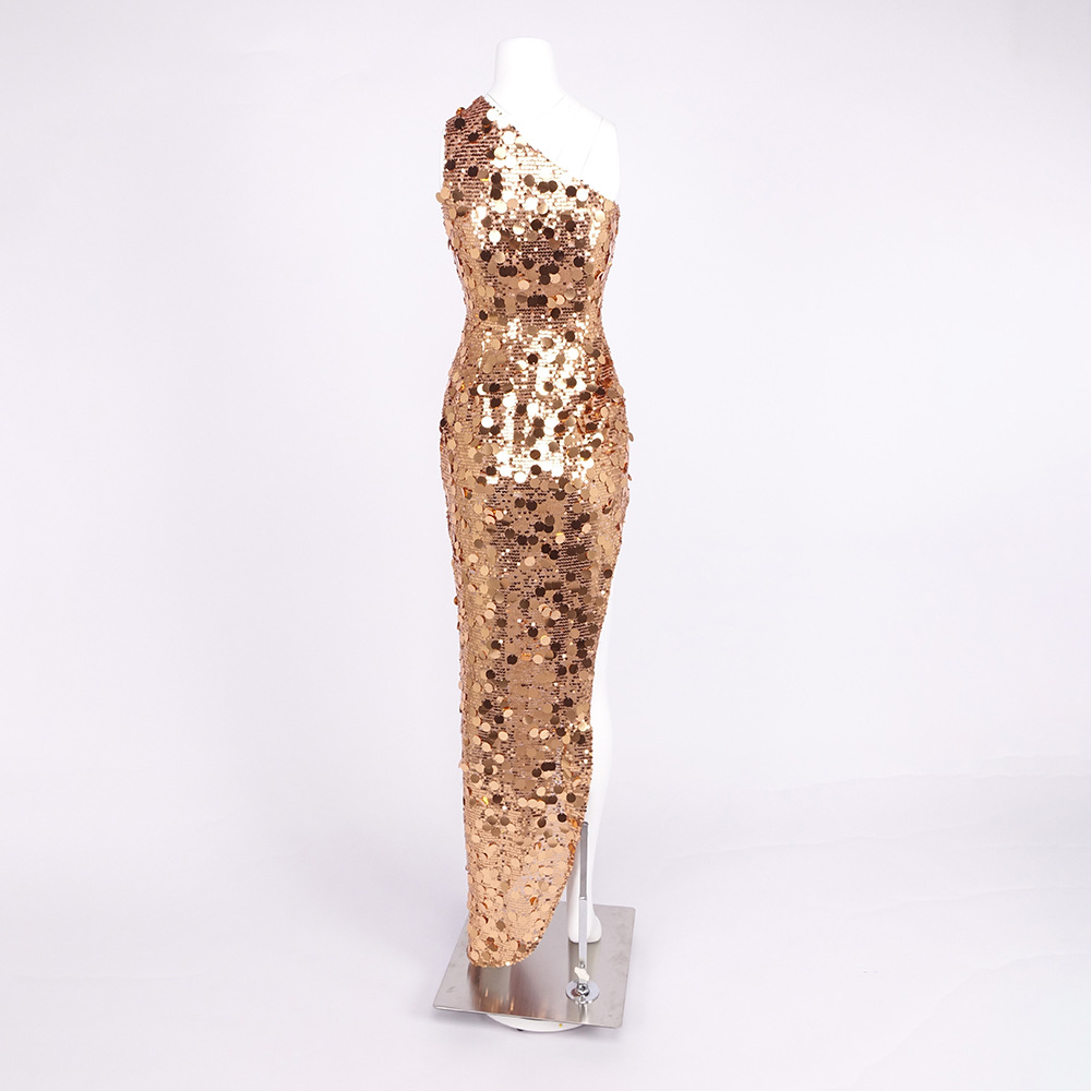 This sophisticated gold sequin maxi dress combines glamorous embellishment with contemporary silhouette design. Crafted from polyester, the sleeveless one-shoulder cut creates an elegant asymmetric neckline, while the bodycon fit accentuates your curves. A dramatic side split and functional zipper detail add modern edge to this formal-ready piece. The all-over sequin pattern delivers eye-catching sparkle perfect for evening events, galas, and special occasions. Versatile enough for year-round wear, this statement dress transitions seamlessly from cocktail parties to formal celebrations.