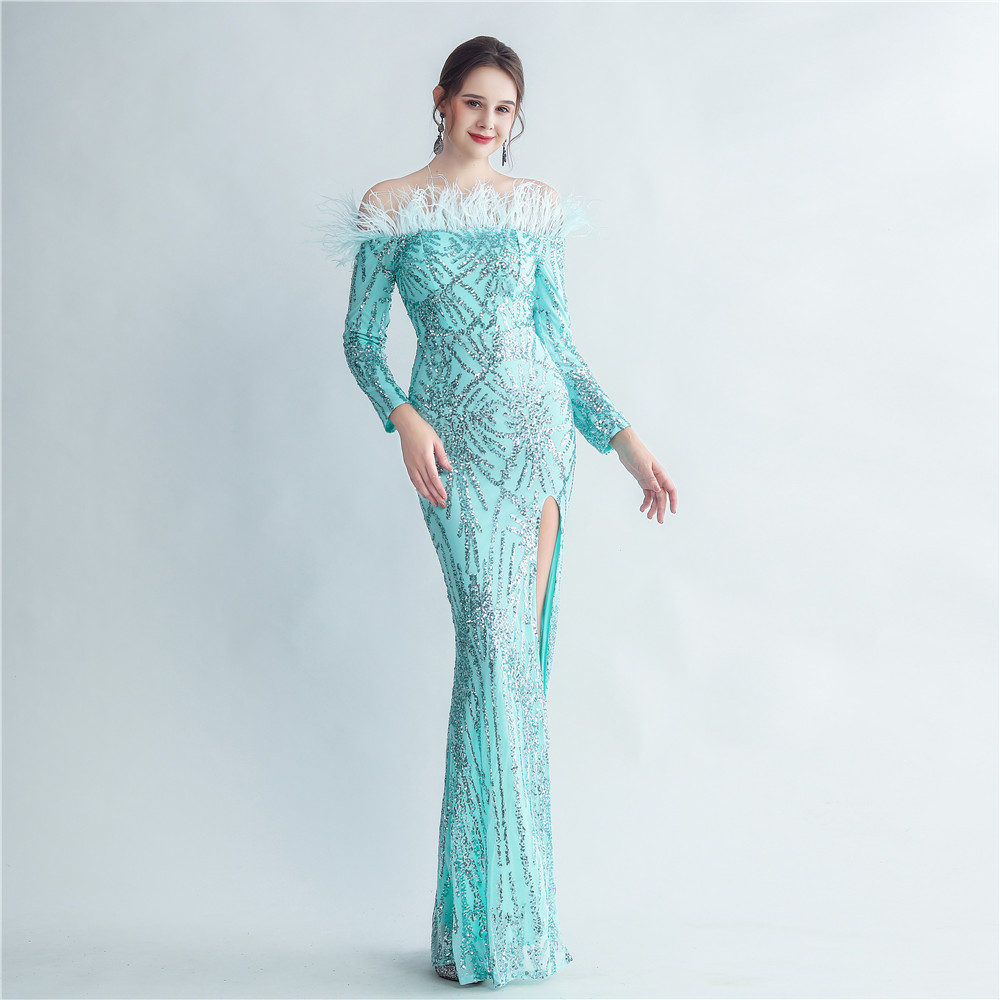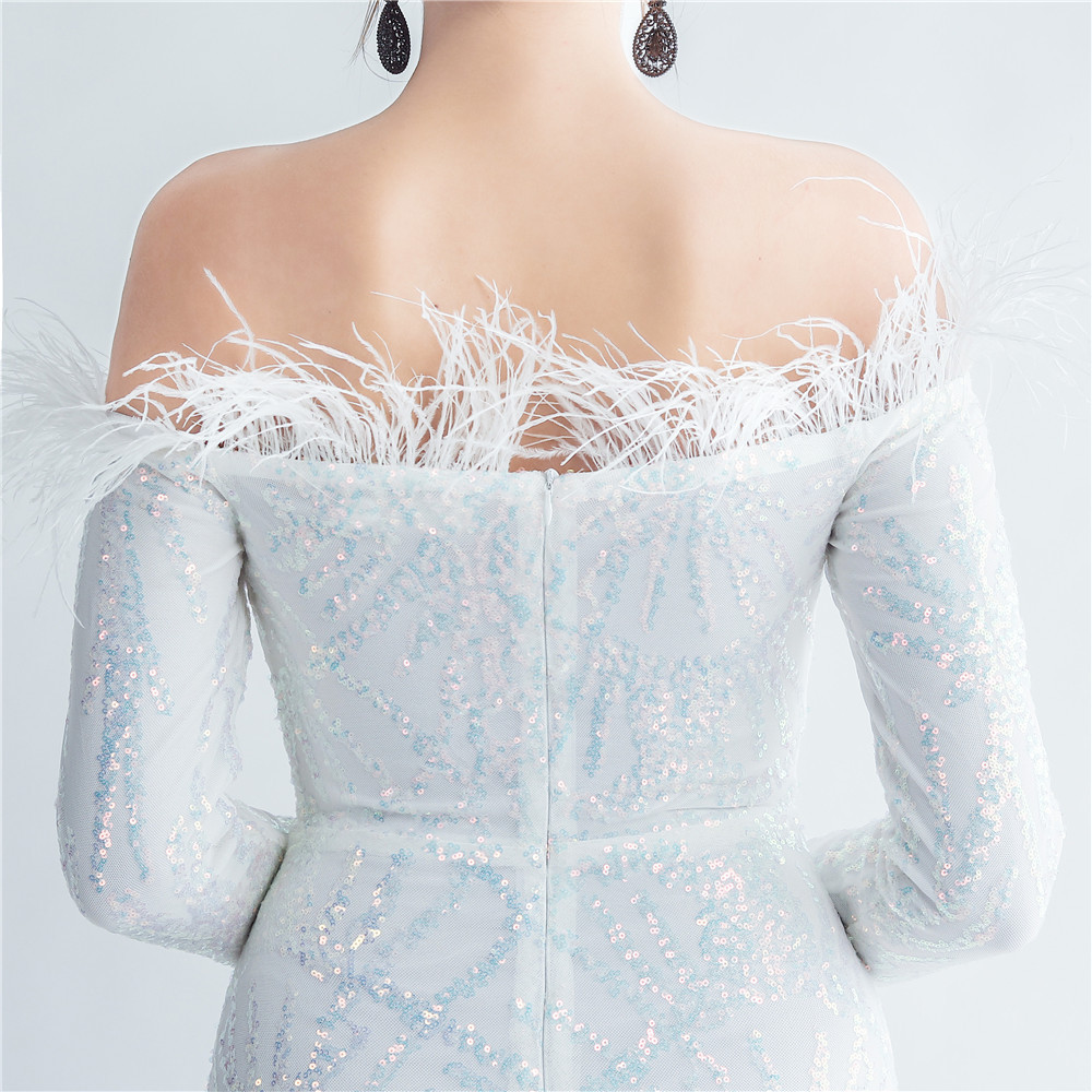 - Look effortlessly stylish and chic in this polyester Lillian Maxi Dress! Featuring an off shoulder neckline, regular long sleeves, a slim fit, and a unique mix of details like feathers, sequins, a split, and a zipper, this maxi dress is perfect for any formal occasion. The playful, quirky design and comfortable fit make it a must-have for your wardrobe.