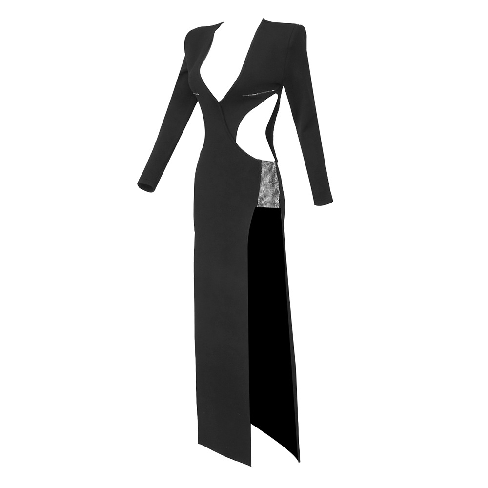 The Zima Cutout Maxi Dress offers a slim and elegant fit with its use of Spandex fabric and solid pattern. Featuring a V-neckline, regular long sleeves, and a variety of stylish elements such as a zipper, split, rhinestones, and lace/tulle/fishnet cutouts, this dress is perfect for formal occasions or party & club wear during the Spring/Fall season.