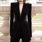 From the perspective of a product expert, this elegant and office-ready blazer and pants set boasts a regular fit and is crafted with durable polyester. Adorned with a solid pattern and embellished with zippers, rhinestones, pockets, and beading, this set features a collared neckline and regular, long sleeves. The pants have a high rise and full length, while the top is long. Perfect for the spring and fall seasons.