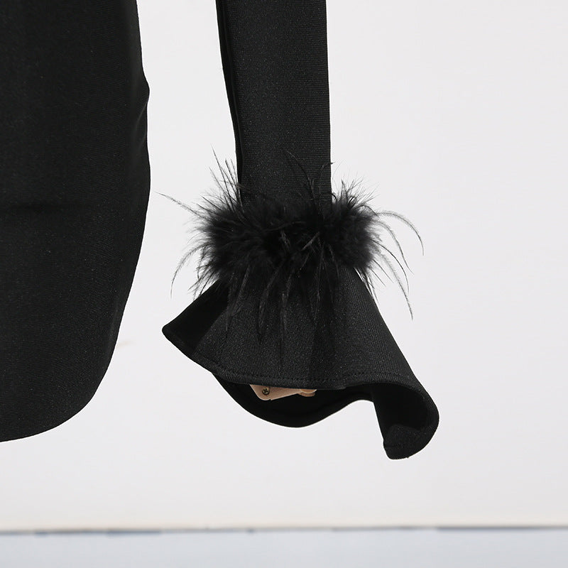 Make a statement with this striking mini dress that seamlessly blends elegance with contemporary edge. Featuring a distinguished stand collar adorned with shimmering rhinestones, this polyester piece commands attention from every angle. The slim-fitting bodycon silhouette is enhanced by strategic cutouts and delicate ruching that create dimension and visual intrigue. Panelled long sleeves add architectural interest while maintaining a refined aesthetic. Feather detailing introduces an unexpected textural element, while the secure zipper closure ensures a polished finish. Ideal for upscale evening venues, cocktail parties, and sophisticated social gatherings during spring and fall seasons. A versatile investment for those seeking distinctive style with understated glamour.