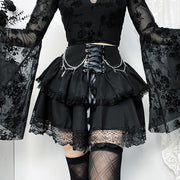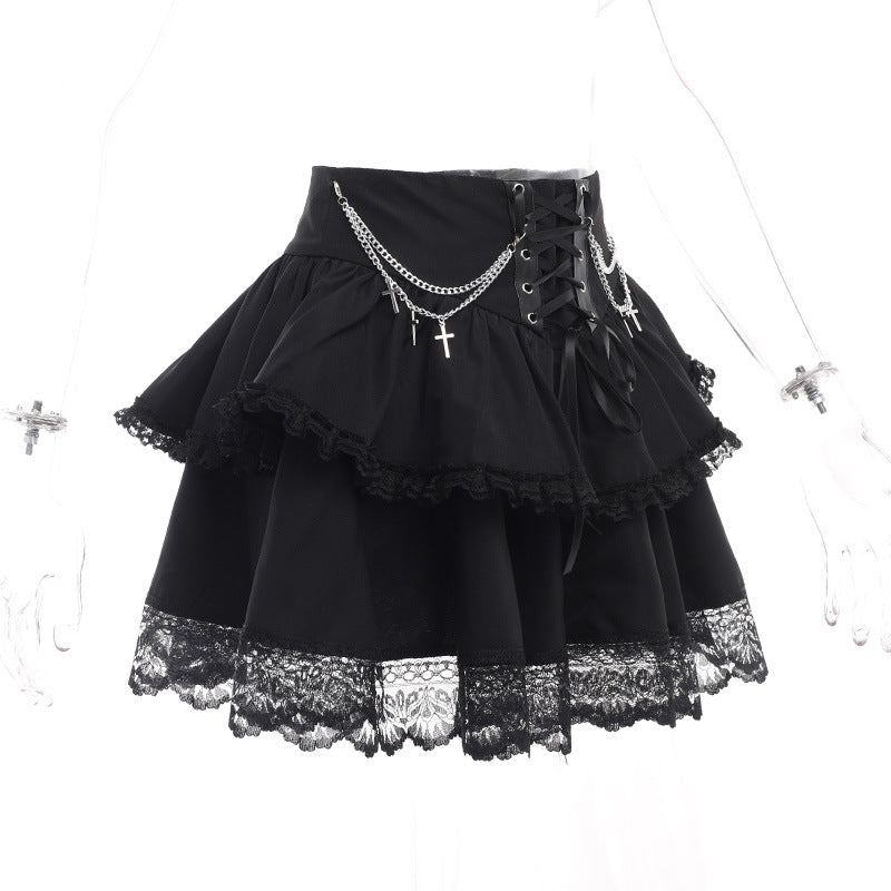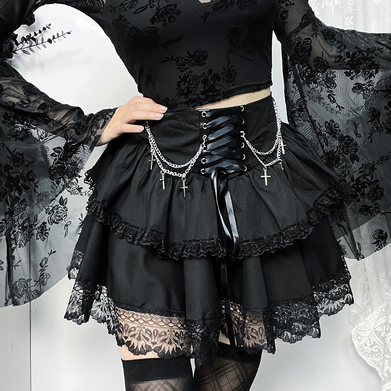 This product features a combination of sexy and elegant styles with a gothic flair. Its loose fit and high rise make it comfortable to wear, while the polyester fabric and lace/tulle/fishnet element add a touch of sophistication. The dress/skirt is designed with a shorter length and metal chain details, creating a unique and edgy look. The A-line shape and polyester composition make it perfect for the Halloween season.