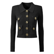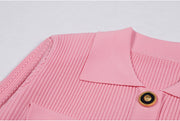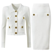 Embrace sophistication and exclusivity with our luxurious Jersey Knit Cardigan + Midi Skirt Set. Perfectly fitted with a slim silhouette and crafted from premium polyester fabric, this set features a classic collared neckline and long regular sleeves. Adding to its allure are elegant button and pocket elements, making this the perfect addition to your high-rise wardrobe for the spring/fall season.